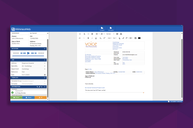 Once a document has been created and populated, the clinician can then review and edit the file (which can also be done using their voice), and distribute it to all relevant parties - all via the one system. As a result, turnaround times can be far, far faster.